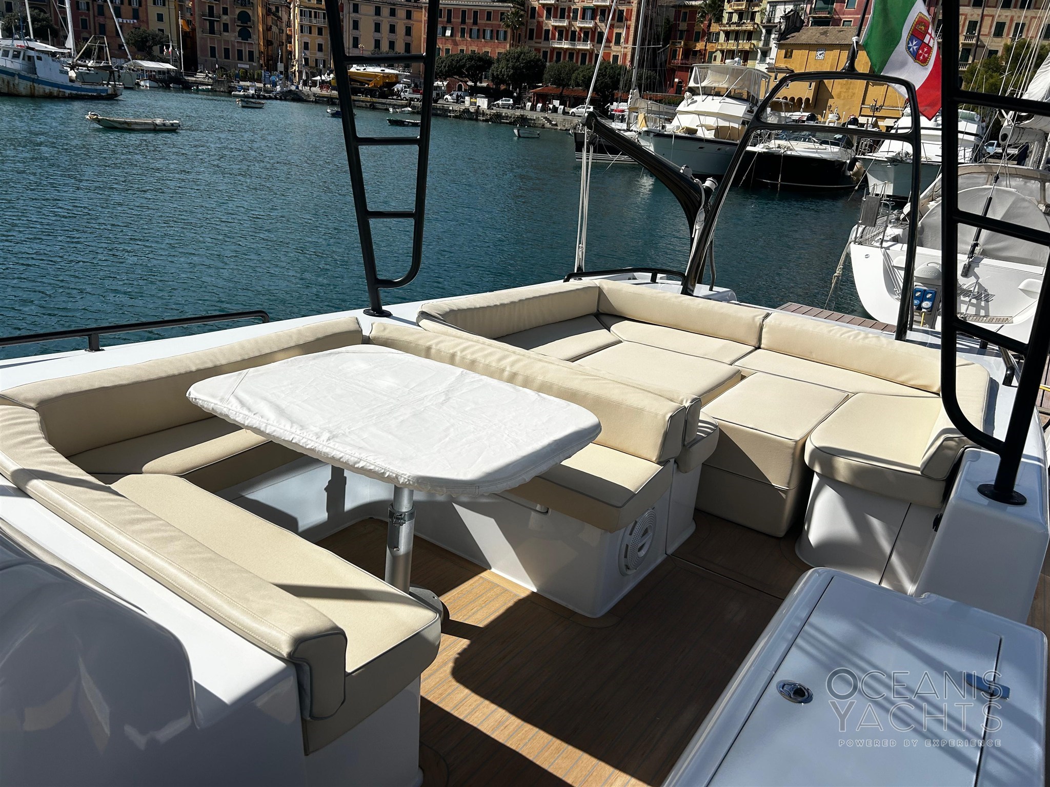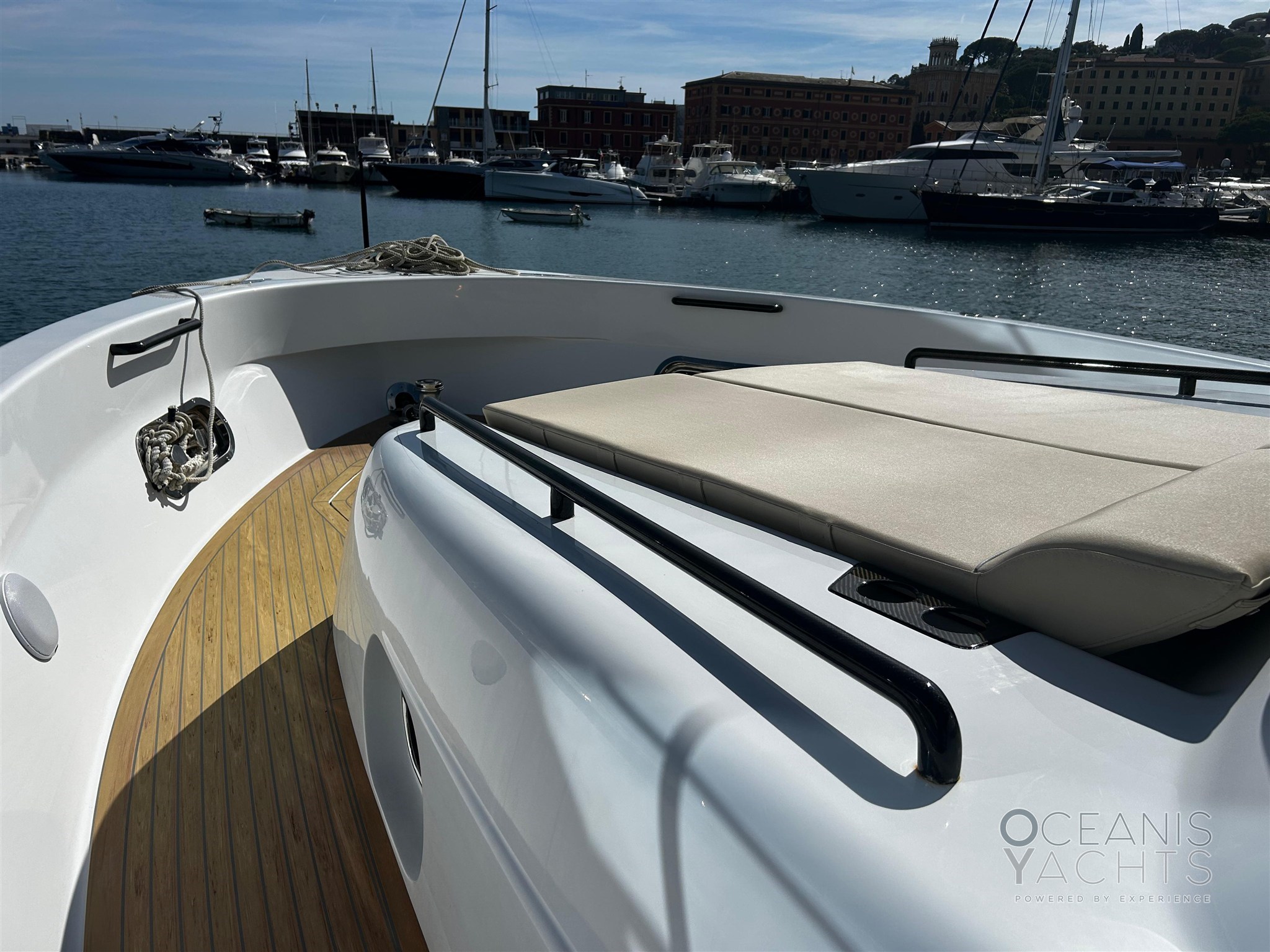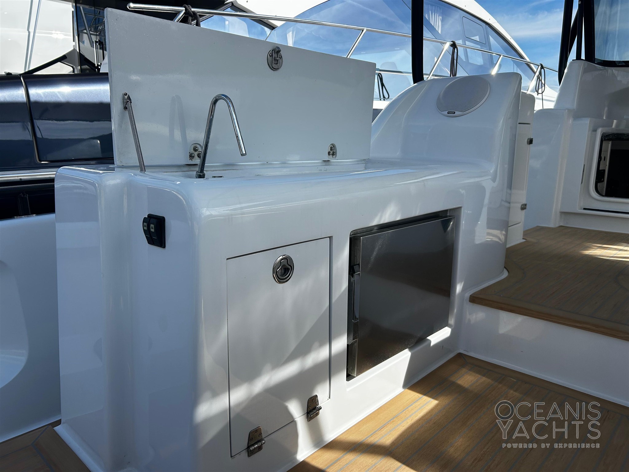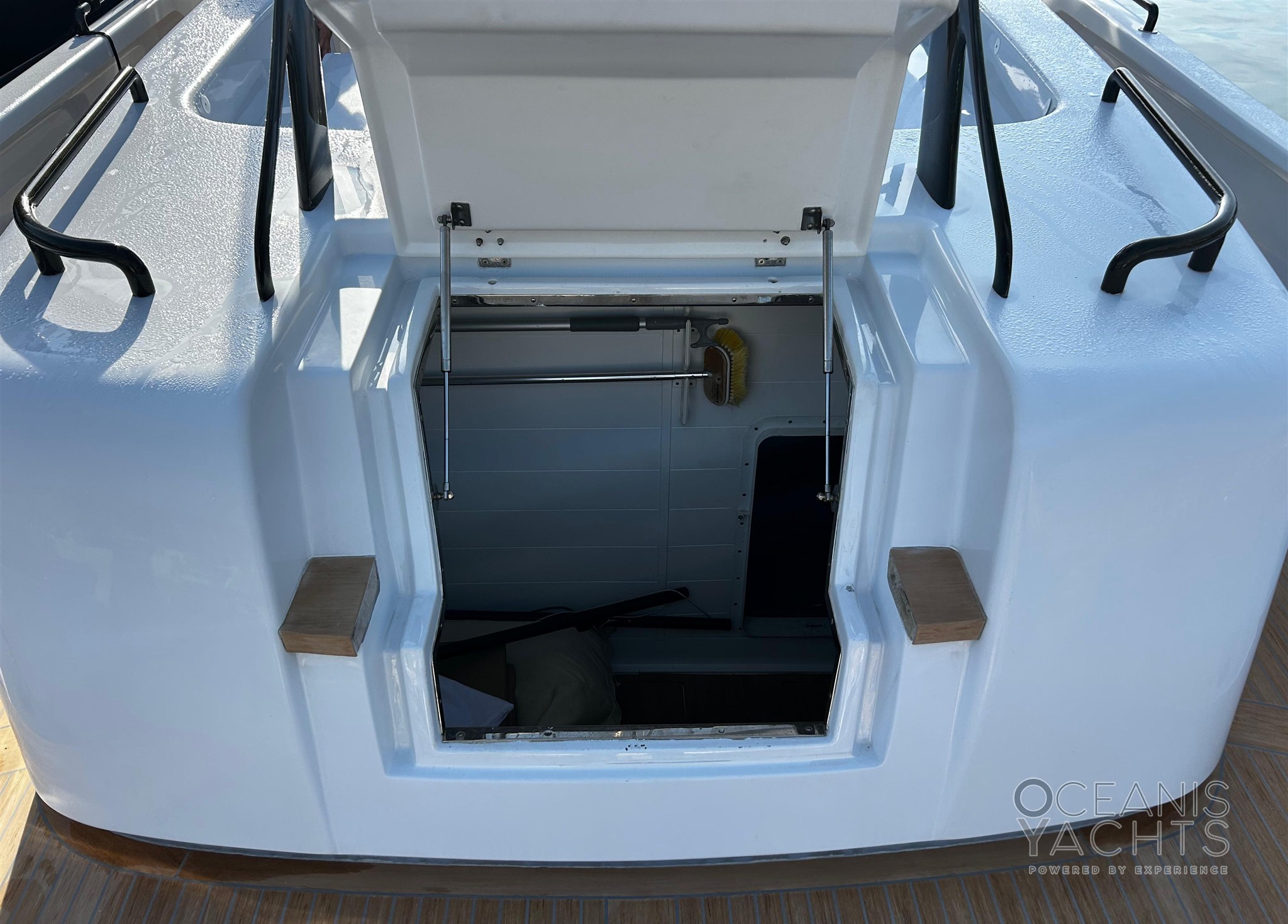 Allarme motore, Allarme sentina, Alternatore, Apertura Vano Motore Elettrica, Autoclave, Colorazione speciale, Doccia esterna, Gruette per tender, Indicatori Flaps, Lavandino nel Pozzetto, Luci di cortesia, Monitor batteria, Parabordi, Passerella, Pompa di sentina automatica, Ponte in teak (sintetico), Porta ingresso, Pozzetto Teak (sintetico), Salpa Ancore Elettrico, Scaletta da bagno, Tavolo pozzetto, Tavolo Salone Abbattibile, Tromba, T-Top.