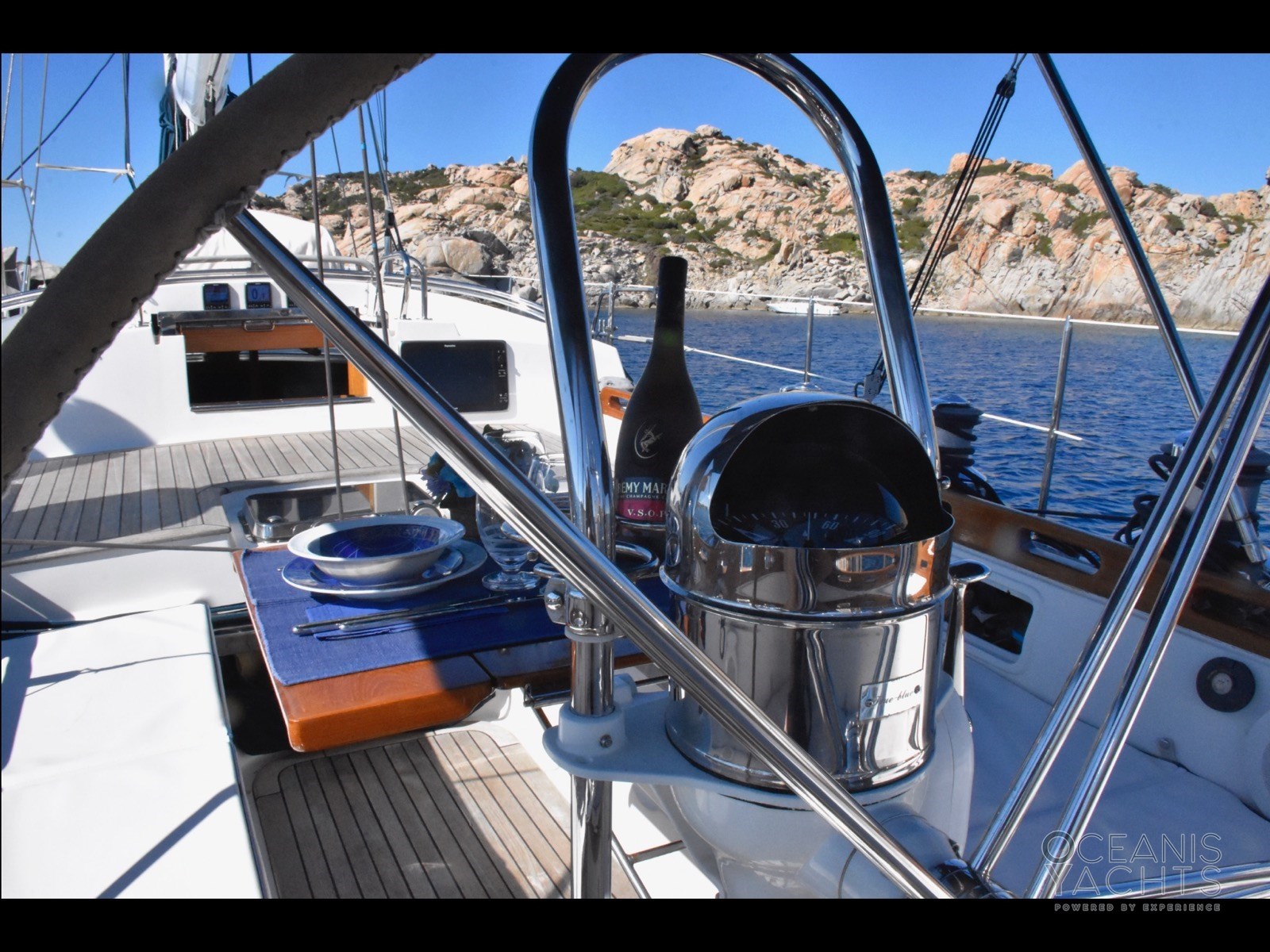 Autoclave, 6 Batterie, Camminamenti laterali in teak, Doccia esterna, Generatore a vento, 2 Gruette, Impianto Aria Compressa, Passerella, Pompa di sentina manuale, Porta ingresso, Pozzetto Teak, Presa 220V banchina, Presa acqua banchina, Ripetitore strumentazione, Salpa Ancore Elettrico, Scaletta da bagno, Tavolo pozzetto, Tender (AB 9.5 Aluminium, Yamaha 15 HP Two Stroke tiller outboard), Tientibene con cancelletti, Tuga in teak, 6 Winch, 2 Winch Elettrico.