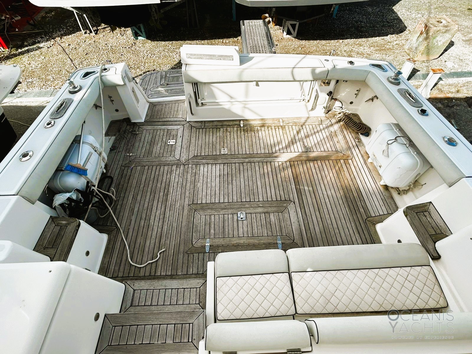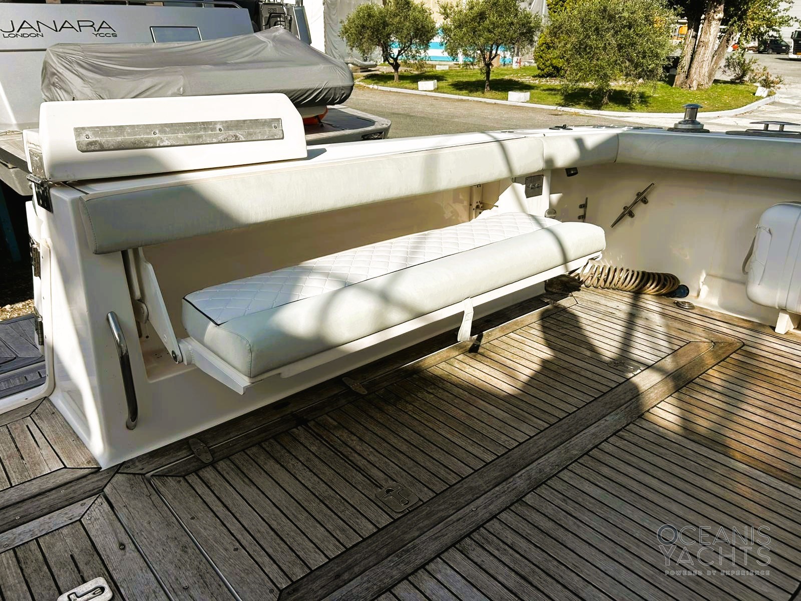 Allarme motore, Allarme sentina, Alternatore, Autoclave, Doccia esterna, Hard top, Lavandino nel Pozzetto, Luci di cortesia, Passerella, Piattaforma, Pompa di sentina automatica, Pompa di sentina manuale, Pompa Lavaggio Ponte, Ponte in teak, Porta ingresso, Pozzetto Teak, Presa 220V banchina, Salpa Ancore Elettrico, Scaletta da bagno, Tromba, Winch tonneggio di poppa.